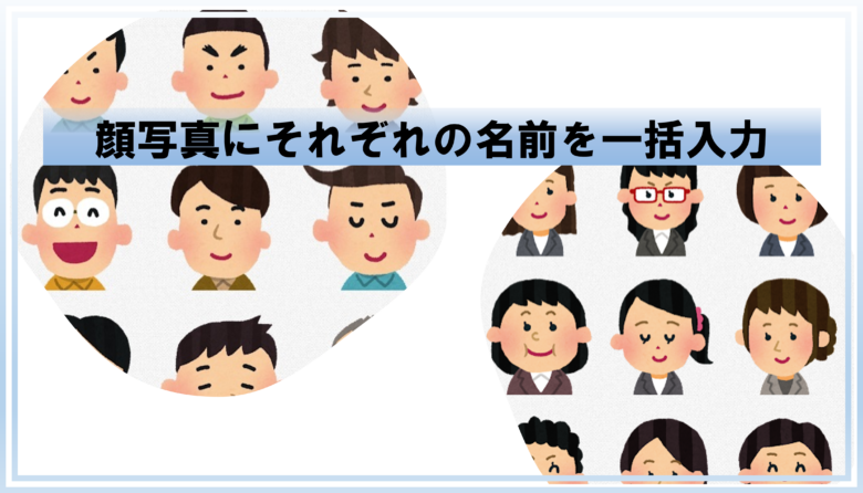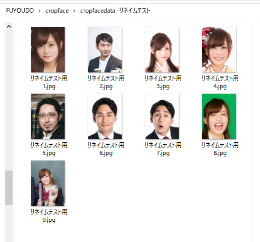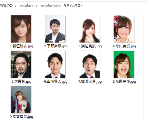 上の顔写真のファイル名を、Excelで用意した新たなファイル名で一括変換をすることができます。