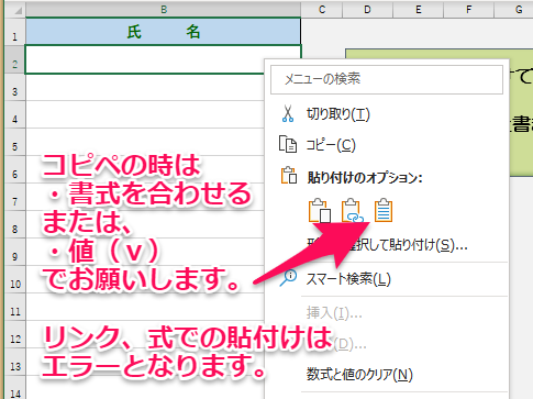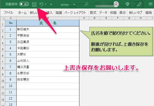 表示されたシートの氏名欄に、変更する新たなファイル名(氏名)を貼り付けてください。