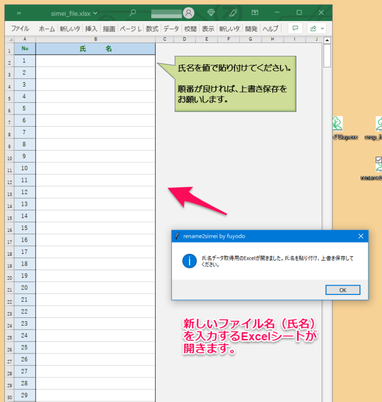Excelの氏名取得用のファイル「simei_file.xlsx」が開きます。